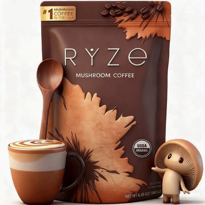RYZE Organic Mushroom Coffee, based on Arabica coffee, incorporates a formula of 6 types of American organic adaptogenic mushrooms. It has low caffeine content, causing no jitters or crashes, while providing sustained energy, enhanced focus, and immune support. It is sugar-free, gluten-free, and vegan, with a smooth instant texture and a nutty chocolate aroma.